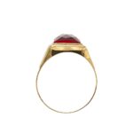 Anello in oro giallo 750°/°° con cubic rossa rubino. Peso: 6,4 GR. Dimensioni sigillo alto 13 mm e largo 9,5 mm.