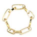 Bracciale in oro giallo 750°/°°. Peso: 21 gr. Lunghezza 20 cm. Spessore maglie 0,9 mm. Chiusura a moschettone,